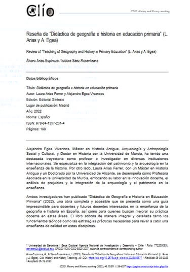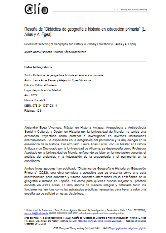 Arias-Espinoza, Á. A., & Sáez-Rosenkranz, I. (2023). Reseña de Didáctica de geografía e historia en educación primaria (L. Arias y A. Egea). Clio. History and History Teaching, 49, 348–351. https://doi.org/10.26754/ojs_clio/clio.2023499577
